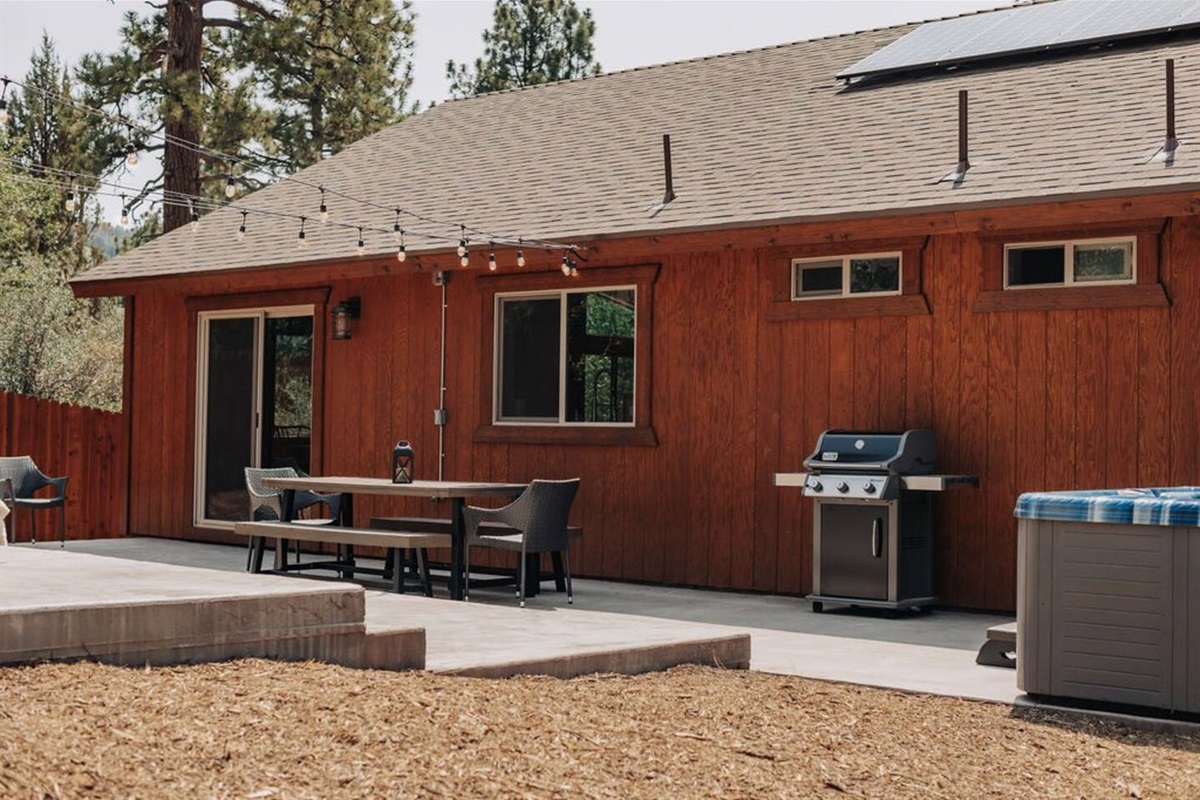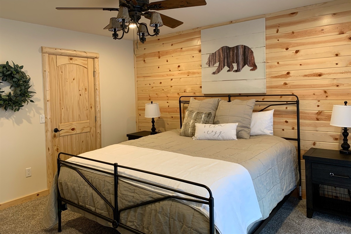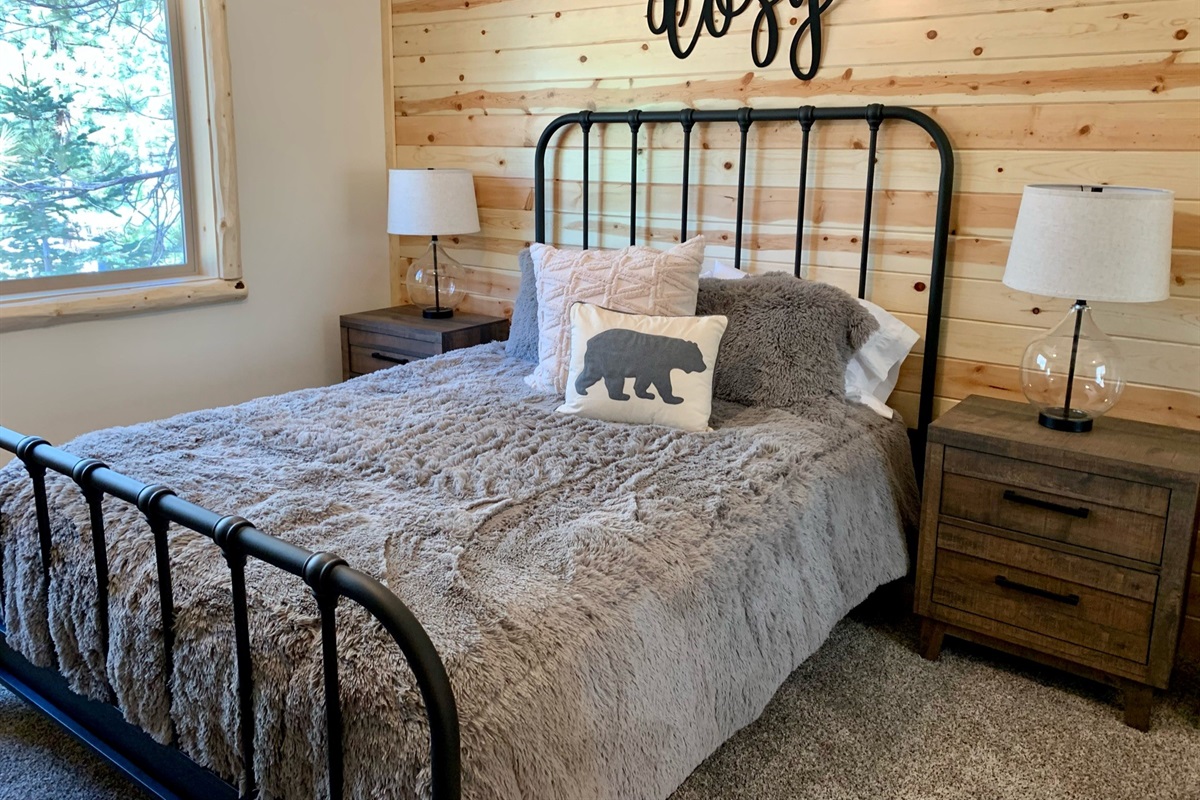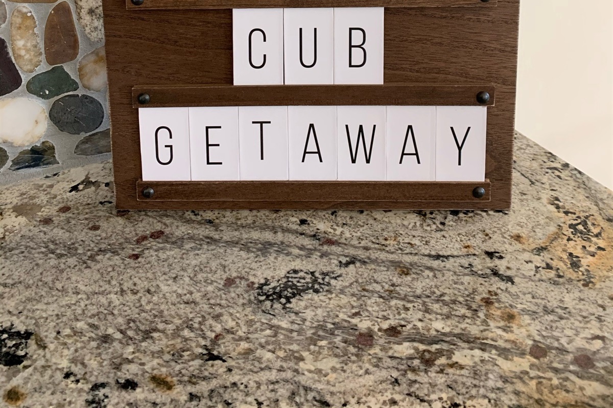 The Cozy Cub Getaway is a newly constructed cabin with brand new everything! It has new furniture, stainless steal appliances, bedding, kitchen supplies, etc. The great room has a large sectional that has a queen size pull out sofa bed. There is a gas burning fireplace, a 60 inch smart tv, and a large wifi blue tooth speaker that can be used to listen to your favorite playlist. You can stream any of your favorite services on the tv or access Direct TV, complete with the NFL Sunday ticket for football lovers. Sit around the large dining table for family meals or to play a game. The cabin comes with a variety of board games and card games. The beautiful kitchen comes equipped with a refrigerator with filtered water, dishwasher, microwave, Keurig coffee maker, toaster, blender, and crockpot. It provides serving for twelve and professional grade Viking pots and pans for all the chefs that visit our home. The master bedroom offers a king size bed, 40 inch smart tv, walk in closet, connecting bathroom, and slider that accesses the backyard. One of the guest rooms has a queen size bed and the other guest room has a full bunkbed with a twin on top and a twin trundle underneath. Both of these bedrooms also have 40 inch smart tv's. The great room and all the bedrooms have ceiling fans. Both bathrooms have a tub/shower combo and come supplied with shampoo, conditioner, body wash, plenty of towels, and there is a blowdryer in each. In the hallway, there is a full washer and dryer that can be used throughout your stay. Our recently completed backyard has an outdoor picnic style dining table, hot tub that seats seven, gas BBQ, large fire pit, and a gaming court to play corn hole and bocce ball (both of which are provided).
