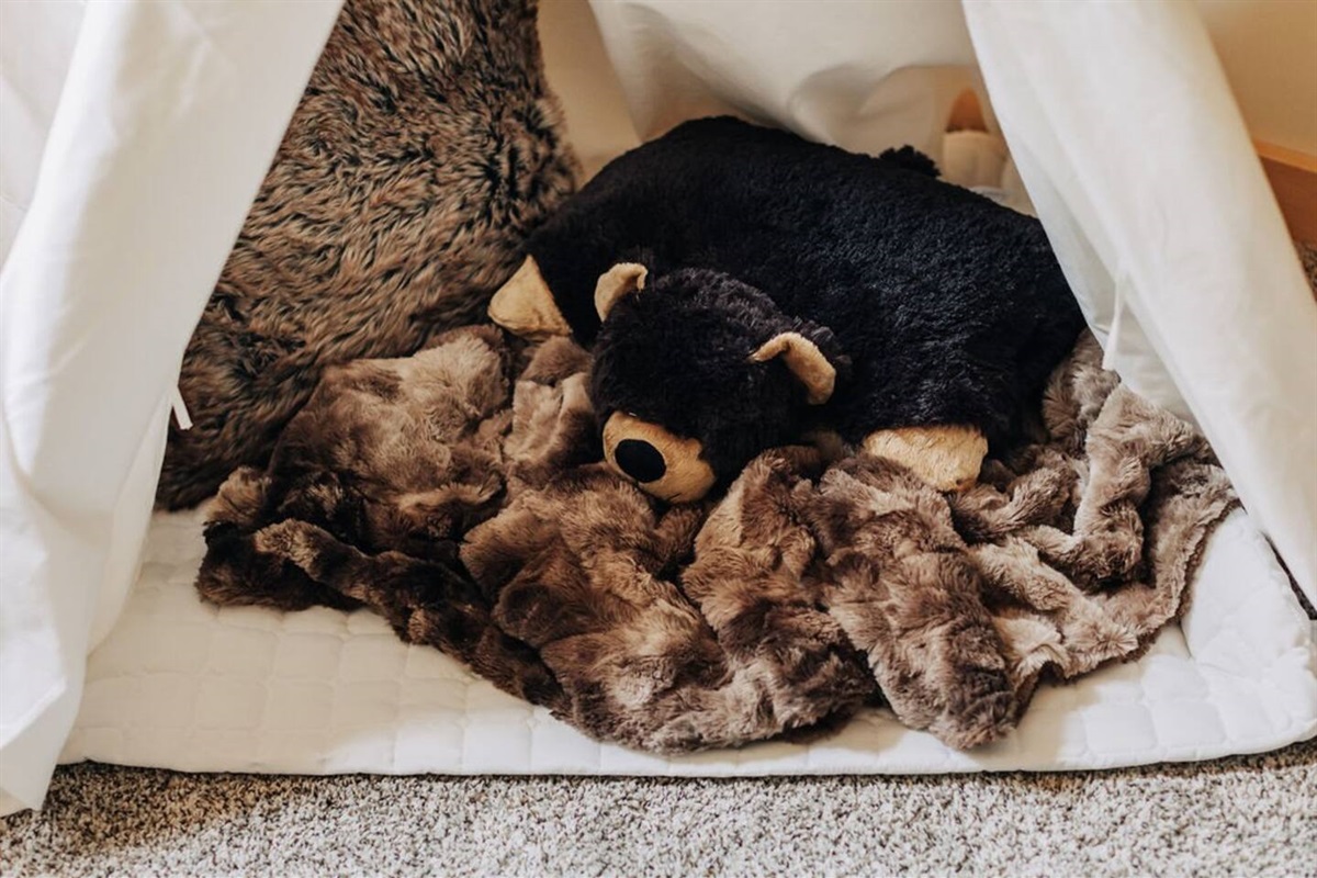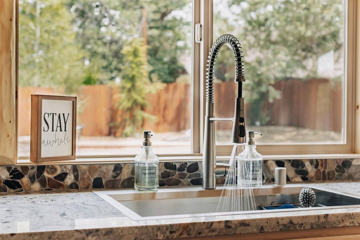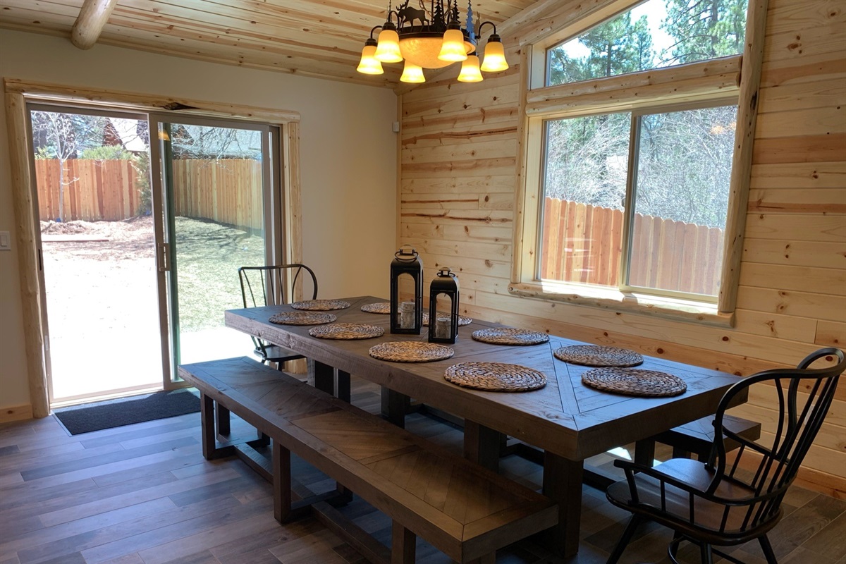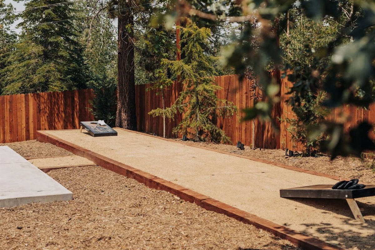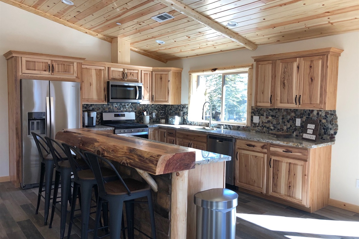 The Cozy Cub Getaway is a newly constructed cabin with brand new everything! It has new furniture, stainless steal appliances, bedding, kitchen supplies, etc. The great room has a large sectional that has a queen size pull out sofa bed. There is a gas burning fireplace, a 60 inch smart tv, and a large wifi blue tooth speaker that can be used to listen to your favorite playlist. You can stream any of your favorite services on the tv or access Direct TV, complete with the NFL Sunday ticket for football lovers. Sit around the large dining table for family meals or to play a game. The cabin comes with a variety of board games and card games. The beautiful kitchen comes equipped with a refrigerator with filtered water, dishwasher, microwave, Keurig coffee maker, toaster, blender, and crockpot. It provides serving for twelve and professional grade Viking pots and pans for all the chefs that visit our home. The master bedroom offers a king size bed, 40 inch smart tv, walk in closet, connecting bathroom, and slider that accesses the backyard. One of the guest rooms has a queen size bed and the other guest room has a full bunkbed with a twin on top and a twin trundle underneath. Both of these bedrooms also have 40 inch smart tv's. The great room and all the bedrooms have ceiling fans. Both bathrooms have a tub/shower combo and come supplied with shampoo, conditioner, body wash, plenty of towels, and there is a blowdryer in each. In the hallway, there is a full washer and dryer that can be used throughout your stay. Our recently completed backyard has an outdoor picnic style dining table, hot tub that seats seven, gas BBQ, large fire pit, and a gaming court to play corn hole and bocce ball (both of which are provided).
